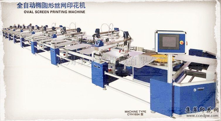 DAZZLE 大展系列多色全自动椭圆型丝网印花机性能特点:本机采用集中控制系统,人机界面,操作简洁。对于少色数的印刷,可实施一机多用。(每个印刷头都完全独立,可单独程序控制)。刮刀由电控运行,更准确平稳,提高清晰度及印花质量。刮刀的形成与角度调节便捷,每把刮刀的工作压力都可单独调整。 整机由PLC控制作业,工作区域与印刷头工作程序可由用户选择组合使用。印刷头之间都配备烘干机,大大增加工作效率。